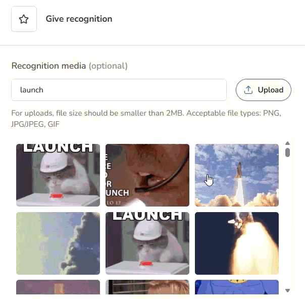 Recognition is more meaningful when it feels personal. Now, employees using a Team Recognition program in Compt can search for and add a GIF (or upload their own GIF or image) to include visuals with every e-thanks or monetary recognition shoutout.